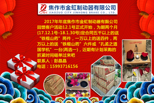 2017年年底焦作市金虹制動(dòng)器有限公司 回饋客戶活動(dòng)12.1號(hào)正式開始為期兩{17.12.1號(hào)-18.1.30號(hào)}定合同五千以上的送“鐵棍山藥”兩件,一萬以上的送四件,兩萬以上的送“鐵棍山藥”六件或“孔孟之道國(guó)學(xué)機(jī)”一臺(tái)(兩選一),近期有計(jì)劃采購(gòu)的抓緊時(shí)間砸單過來吧!
